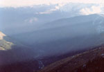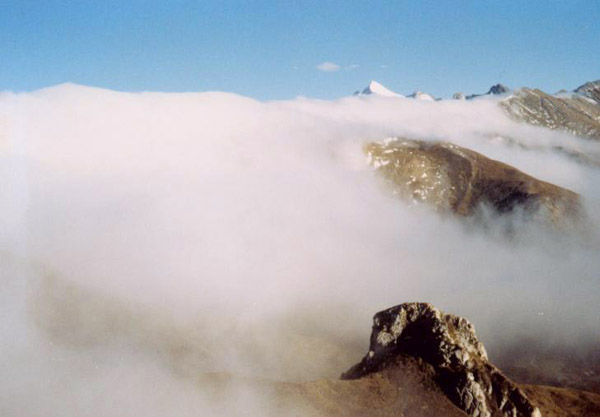 形成了奇景; 在遠處的尖高雪峰就是"雪寶鼎"(海拔5,588米)。我們停車觀看, 直到雲霧吹到我們面前快將我們包圍時才上回車走。