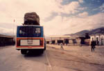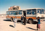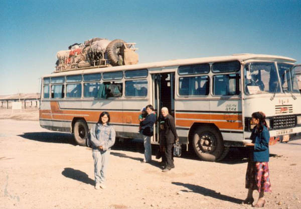 | 這是我們乘坐的公共汽車, 車頂上有很重的行理, 車頭有一塊牌(被維族女仔阻了)寫著"安全行駛84萬公里",