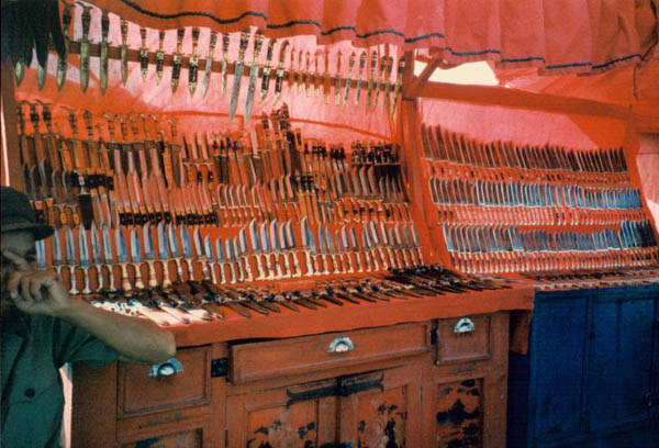 維吾爾人喜歡用這種小刀, 每人身上都有一把, 這裡四周圍都有賣刀攤檔, 有不同款式小刀擺賣。 |