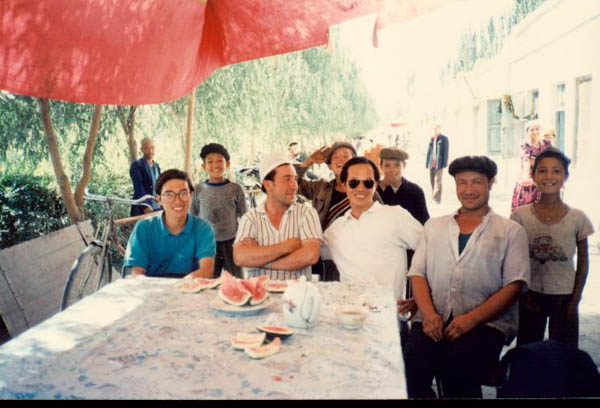 | 在英吉沙一間飯店吃飯, 老闆非常熱情(坐在我及皇帝中間的一位), 請我們吃西瓜外還帶我們到造刀廠買小刀,