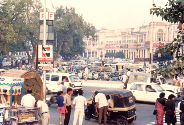 新德里最繁忙的市中心 - 康樂廣場(Connaught Place), 周圍有不少攤檔, 人又多, 圖中還有"三腳雞"的士(黑色黃間)出現,