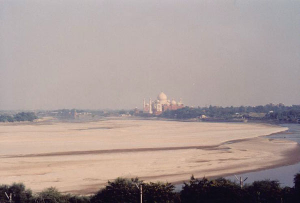 | 在Agra Fort遠觀泰姬陵, 前面的河是Yamuna River, 是恆河上游的一條大支流, 由於這時不是雨季,