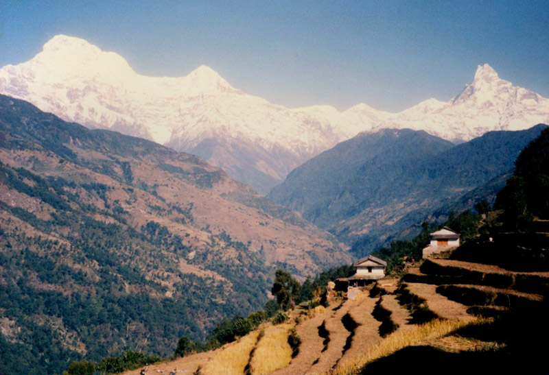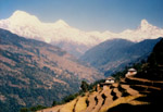 | 約11時開始下山, 不走回頭路行另一條路線, 目的地是Birethanti(1065公尺), 沿途風景優美, 任何地方都可以見到雪山。由於是落山,