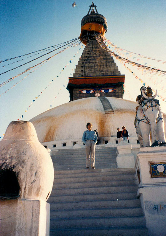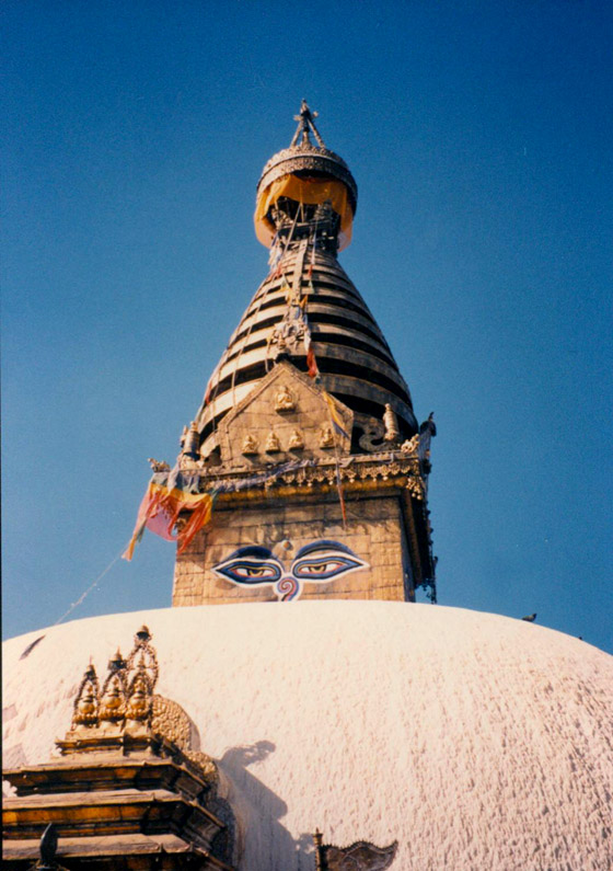 由於是下山, 所以飛快地不到半小時便到達。八眼神廟是尼泊爾最大的佛骨塔, 注意廟頂是四方錐形, 四面各有一對眼, 代表眼看四方, 即是看透這個世界。